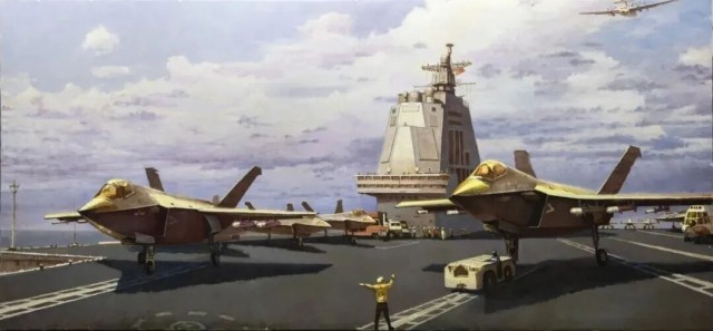 油画《箭上弦》,作者周补田。福建舰作为我国首艘采用电磁弹射技术的航母,标志着海军装备科技迈入全新阶段。歼—35作为新一代舰载战斗机,从列装到亮相九三阅兵,成为我国国防实力的生动注脚。通过画笔,“科技强军”的抽象概念转化为具象画面,并且不再是传统军事题材中单一的武器展示,而是聚焦歼—35在福建舰上“准备弹射”这一动态瞬间——如箭在弦,使命必达。