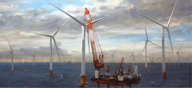 油画《惠来——海上风电》,作者冯少协。“海上风电走廊”点亮万亿绿能、海洋牧场智慧养殖平台矗立海面……“海上新广东”美丽画卷正徐徐铺展。作者将真实见闻诉诸笔端,以饱满的激情和开阔的构图,描绘了碧海蓝天间风电机组的宏伟矩阵。作品中,天空与海面构成宁静却充满张力的场域,工业力量与诗意图景相融,绘就清洁能源发展新篇章。