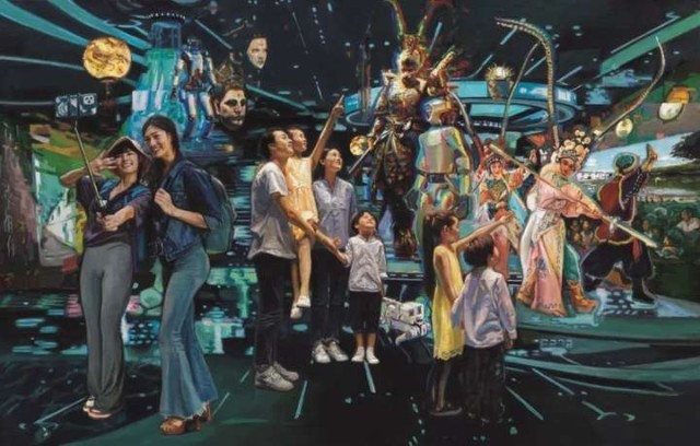 油画《文化的力量——深入推进“文化+科技”“文化+旅游”“文化+民生”》,浙江省油画院集体创作。近年来,文化创新创造活力涌动,“文化+”跑出美好生活加速度。作品生动捕捉这一时代脉动,以科技馆为背景,通过描绘不同年龄、不同身份、不同群体的观众,借助科技等力量乐享多元文化的场景,展现了文化与科技、旅游、民生融合发展趋势,以及其赋能人民美好生活的广阔空间。