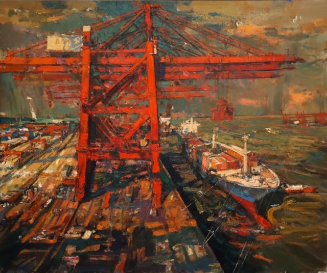油画《扬帆起航——海丝起点之厦门港码头》,作者刘玉龙。东海之滨,海丝古港——厦门港正全力转型升级,不断续写传奇。作品撷取港口码头一景,以厚重的笔触刻画了林立的起重机和穿梭的船只等,折射出21世纪海上丝绸之路重要节点的繁忙景象与磅礴气象。