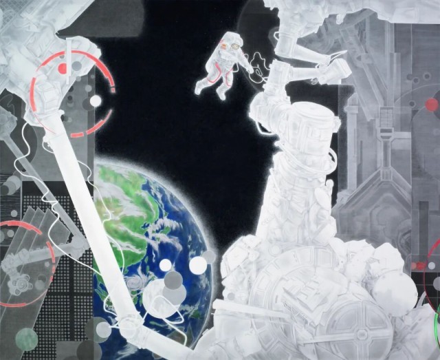 中国画《出舱》,作者杨斌。“十四五”以来,我国载人航天技术向着更高层次不断跨越。作品描绘了翟志刚、王亚平、叶光富3名航天员,在神舟十三号载人飞船与空间站组合体完成自主快速交会对接后,乘组执行第一次出舱活动的场景。作者以墨色的浓淡渲染以及物象的几何形态构成,营造出科技美感和浓浓诗意;黑白的强烈对比进一步凸显宇宙的浩渺深邃,为读者留下无限想象空间。