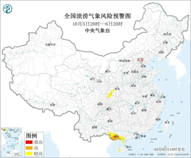 中央气象台10月5日18时发布渍涝风险气象预报:受强降雨的影响,预计10月5日20时至6日20时,广东西南部、广西南部和西部、海南西部、四川东北部、陕西西部等地部分地区发生渍涝的气象风险较高,其中,广西南部等地部分地区发生渍涝的气象风险高,易形成城市内涝和农田渍害,需加强防范。