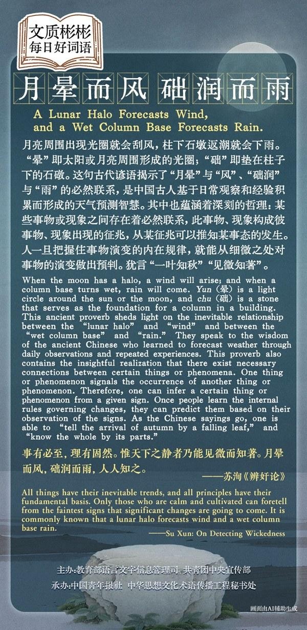 月亮周围出现光圈就会刮风,柱下石墩返潮就会下雨。“晕”即太阳或月亮周围形成的光圈;“础”即垫在柱子下的石墩。这句古代谚语揭示了“月晕”与“风”、“础润”与“雨”的必然联系,是中国古人基于日常观察和经验积累而形成的天气预测智慧。其中也蕴涵着深刻的哲理:某些事物或现象之间存在着必然联系,此事物、现象构成彼事物、现象出现的征兆,从某征兆可以推知某事态的发生。人一旦把握住事物演变的内在规律,就能从细微之处对事物的演变做出预判。犹言“一叶知秋”“见微知著”。
