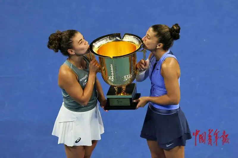 △10月5日,北京国家网球中心,2025中国网球公开赛女子双打决赛,保利尼(左)和埃拉尼亲吻冠军奖杯。在当日的比赛中,意大利组合保利尼/埃拉尼以总比分2-1逆转战胜加藤未唯/斯朵拉组合,夺得冠军。她们也成为中网2004年创办以来首对卫冕的女双组合。中青报·中青网记者 曲俊燕/摄