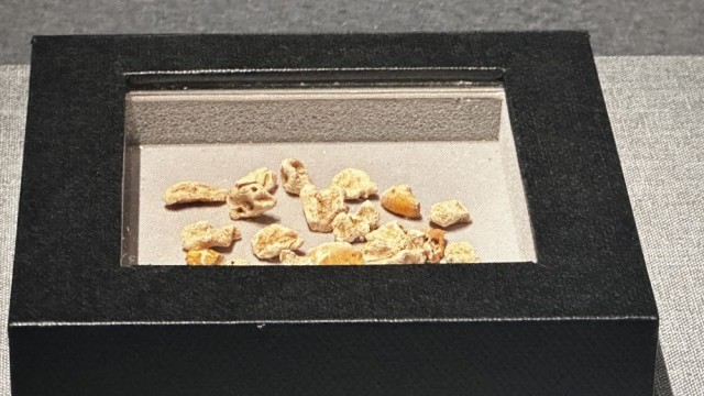 拼版图片:左图为羊头纹杏形金饰片,右图为羱羊银马珂。新华社记者 袁慧晶 摄