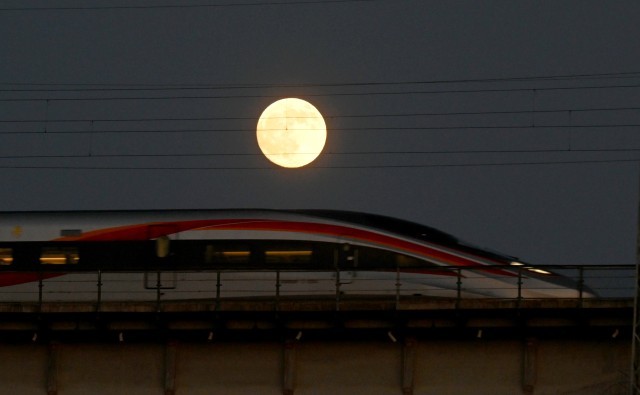 △福建福州,一列“复兴号”动车组列车与圆月同框。 中新社记者 吕明 摄