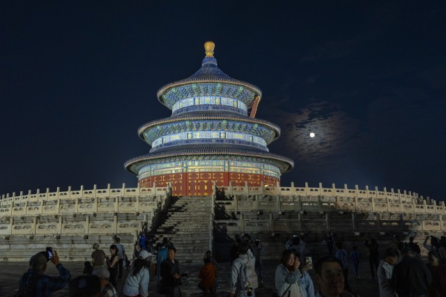 △北京天坛公园祈年殿亮灯,一轮圆月从东方升起,与祈年殿交相辉映。 中新社记者 张炜 摄