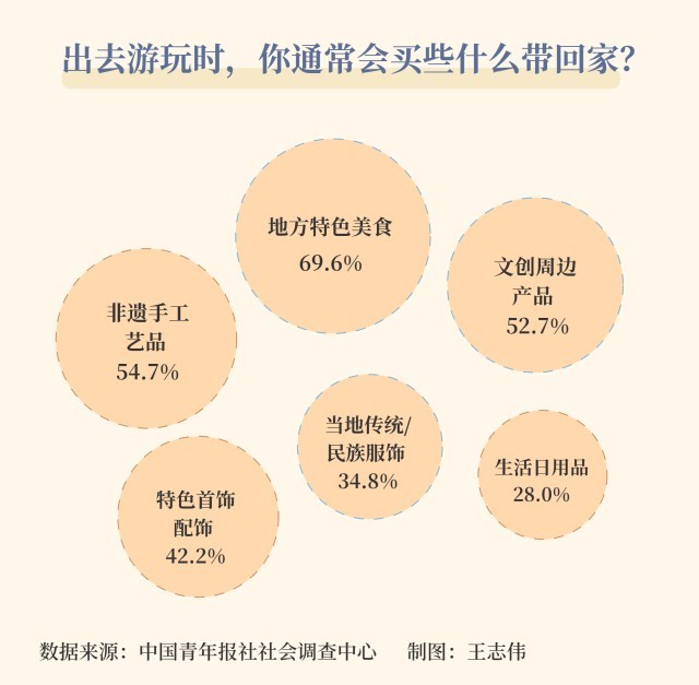 出去游玩时,大家通常会买些什么带回家?调查显示,地方特色美食排在首位,获选率为69.6%,非遗手工艺品(54.7%)和文创周边产品(52.7%)也是大家常买的类型,获选率均超过五成。其他还有:特色首饰配饰(42.2%),当地传统/民族服饰(34.8%),生活日用品(28.0%),美妆护肤品(16.6%)。