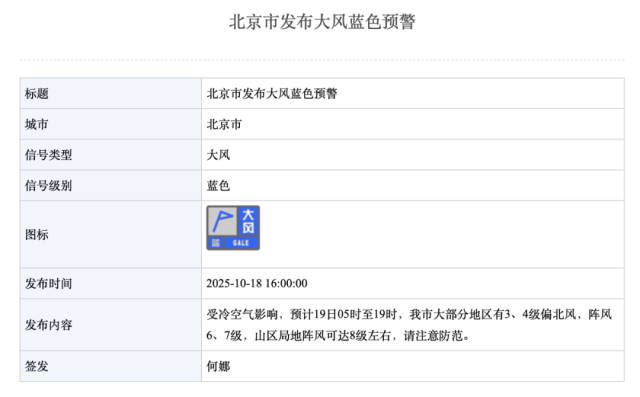 10月18日16时,北京市发布大风蓝色预警:受冷空气影响,预计19日5时至19时,本市大部分地区有3、4级偏北风,阵风6、7级,山区局地阵风可达8级左右,请注意防范。