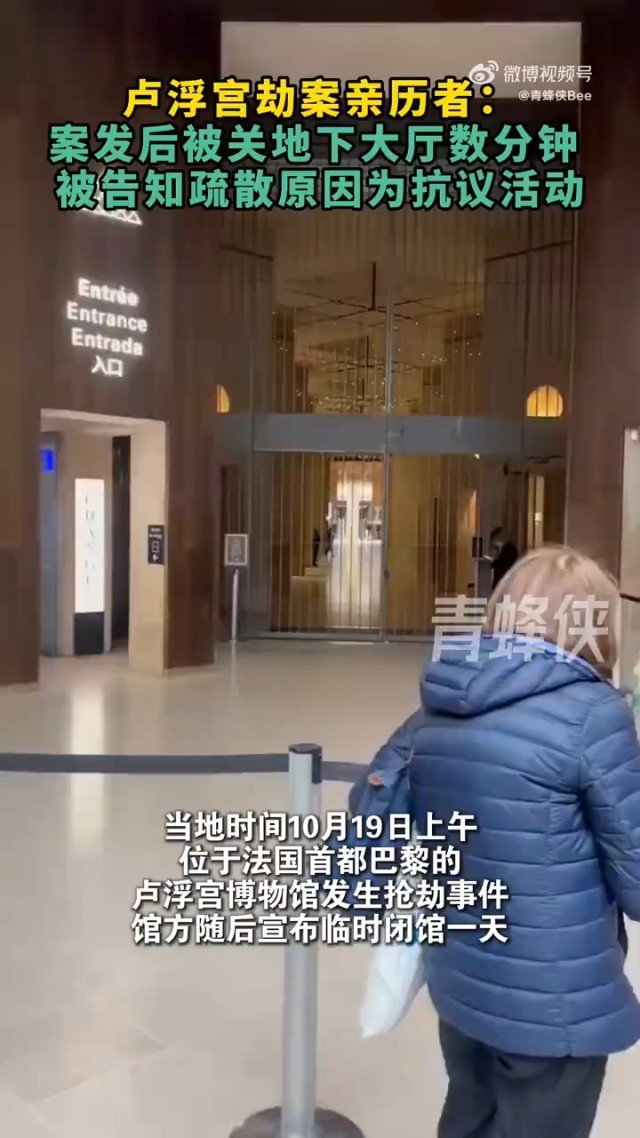 据青蜂侠,当地时间10月19日上午,法国巴黎卢浮宫博物馆发生抢劫事件。在法留学生詹女士向青蜂侠讲述了卢浮宫劫案的亲身经历。詹女士称,在维纳斯雕像前突然被工作人员告知需要紧急疏散并且闭馆一天。随后詹女士与其他游客在地下大厅被滞留十分钟左右,工作人员才放开出口允许游客离开。据詹女士讲述,疏散现场詹女士曾询问工作人员原因,工作人员回答“有一群激进分子在举行抗议活动”。詹女士称,直到二十分钟后走出卢浮宫,手机有信号后,才得知真实原因是卢浮宫被盗。