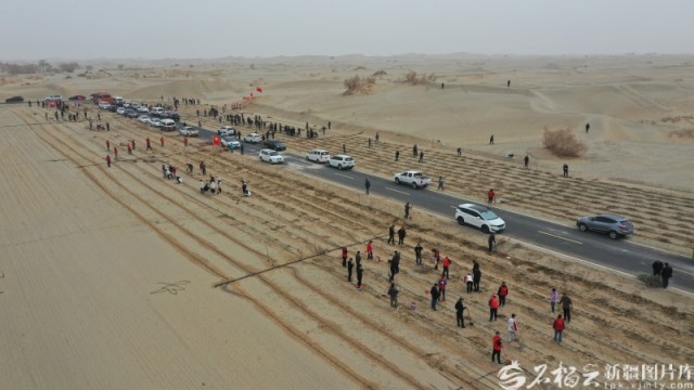 今年3月12日,和田市各族干部群众参加春季义务植树活动(航拍图)。阿巴拜科日摄