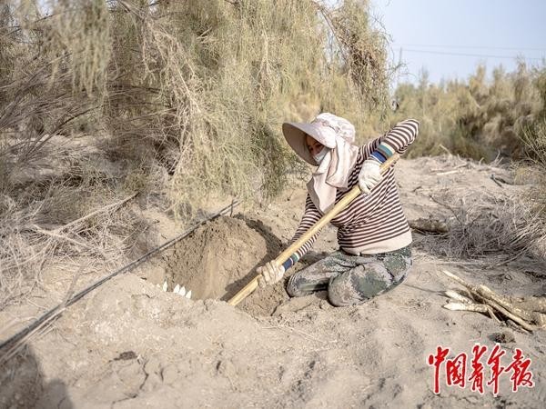 10月23日,新疆阿克苏地区,一名来自四川的女工正在挖肉苁蓉,每挖出一公斤她可以赚1元。