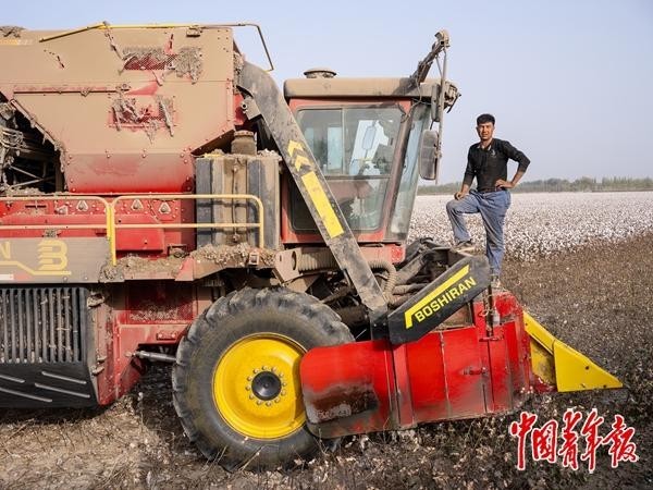 10月20日,新疆阿克苏地区,莫民·吾热依木站在棉花收割机上。他和徒弟两人操作收割机,每天可以完成约100亩棉田的采收工作。