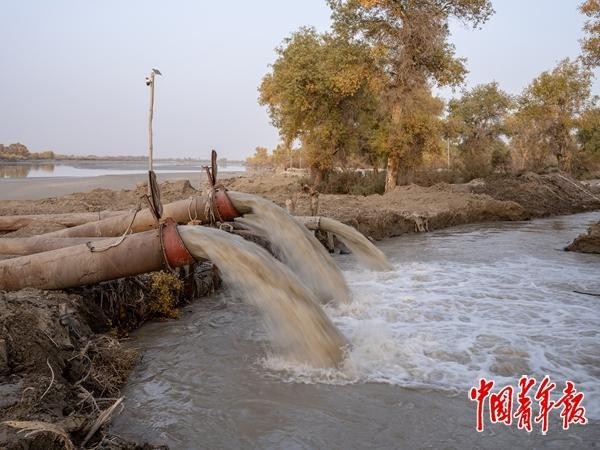 10月22日,新疆阿克苏地区沙雅县,塔里木河的河水通过抽水泵被灌溉进胡杨林。