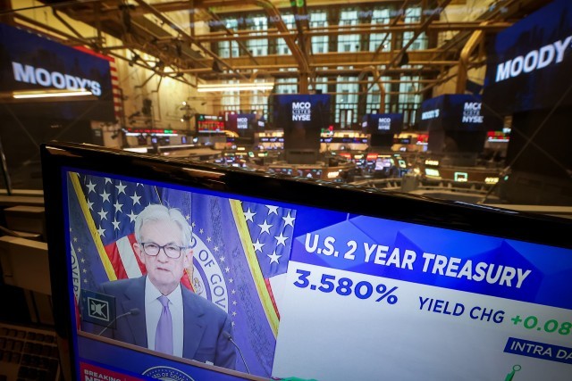 10月29日,美国纽约,纽约证券交易所内,电视屏幕上播放着美联储主席杰罗姆·鲍威尔演讲的画面。鲍威尔表示将于12月1日停止缩减央行资产负债表。视觉中国供图