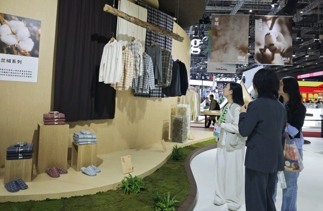 11月6日,有专业观众观察MUJI無印良品法兰绒系列展品。该展台布置植被与土壤。中青报·中青网记者朱彩云/摄