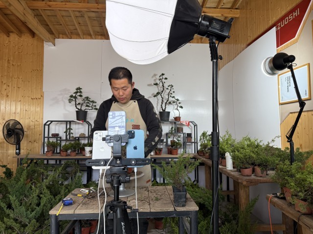 在扎下镇艺森园盆景基地,主播通过镜头,向全国客户热情推介特色花木产品,在沭阳这种盆景的宣传推介方式已经成为一种常态。夏茹/摄