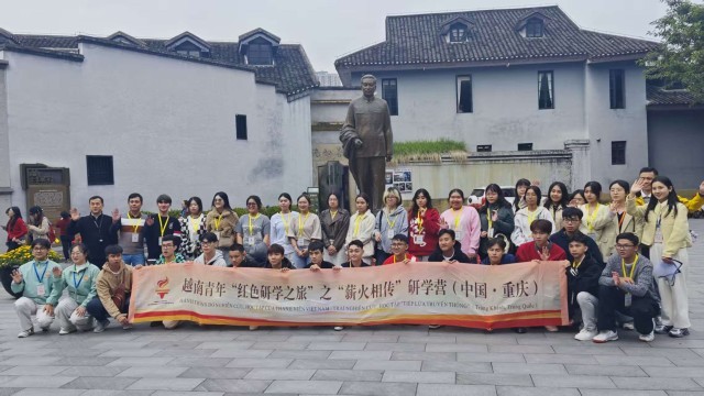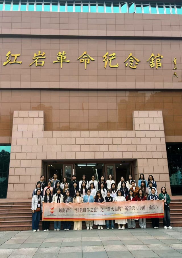 中国青年报客户端讯(中青报·中青网记者 张昊天 李媛媛 李悦 国新冠)11月13日,来华参加“红色研学之旅”之“薪火相传”研学营的越南青年代表团抵达重庆。当天下午,来自越南5所大学的200名青年代表分组参访了红岩革命历史博物馆、曾家岩50号周公馆、桂园(重庆谈判旧址)。