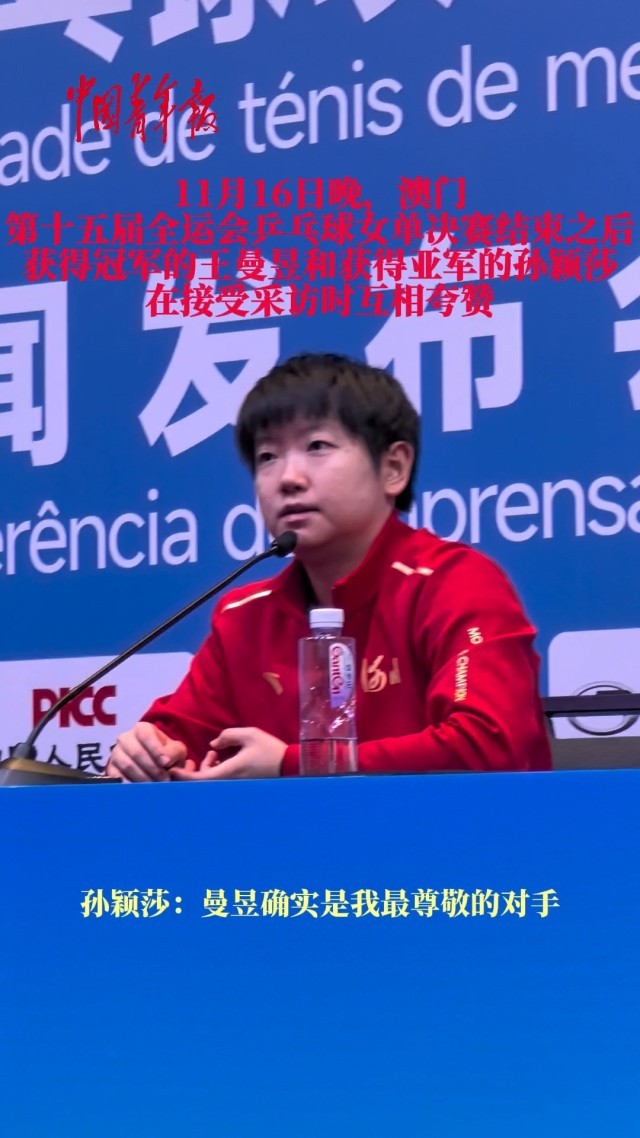 中国青年报客户端讯(中青报·中青网记者慈鑫)11月16日晚,第十五届全运会乒乓球女单决赛在澳门落幕。这场本届全运会的焦点之战以王曼昱的成功卫冕和孙颖莎再次获得亚军而告终。比赛结束之后,“海产姐妹”(球迷对孙颖莎、王曼昱的昵称)在新闻发布会上开启了互夸模式,这也让外界看到了当下这对中国女乒最强姐妹花在竞争之外的深厚情谊。
