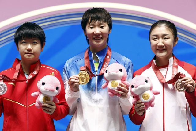 11月16日晚,澳门,第十五届全运会乒乓球女单颁奖仪式,图为获得冠军的王曼昱(中)、获得亚军的孙颖莎(左)、获得季军的陈梦(右)合影。视觉中国供图