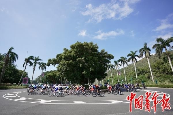 11月8日,香港,十五运会公路自行车男子个人赛决赛,运动员们通过香港迪士尼乐园外的折返点。这是全运会史上首次举办跨境比赛,选手在途中经过港珠澳大桥,横跨粤港澳三地。在11月9日全运会开幕式举行前,包括公路自行车在内的部分项目提前开赛。中青报·中青网记者 李隽辉/摄