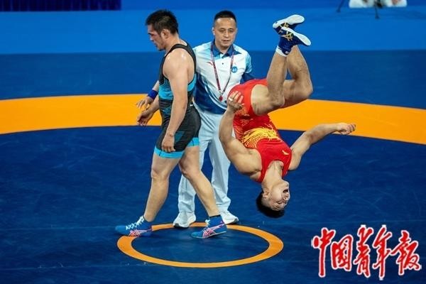 11月12日,广东清远,十五运会摔跤男子自由式86公斤级铜牌赛,河南队选手张恒(右一)获得季军后庆祝。中青报·中青网记者 李隽辉/摄