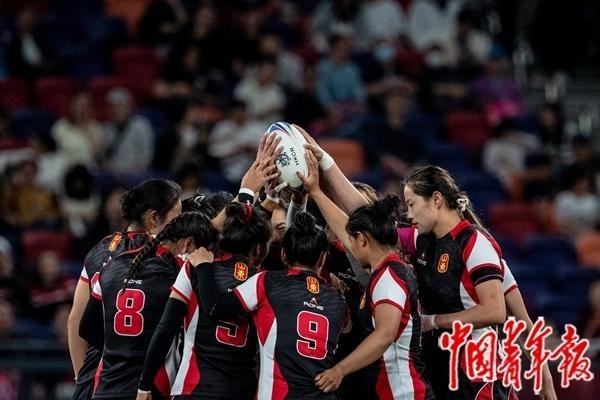11月14日,香港,十五运会七人制橄榄球女子组决赛,山东队在赛前加油。中青报·中青网记者 李隽辉/摄