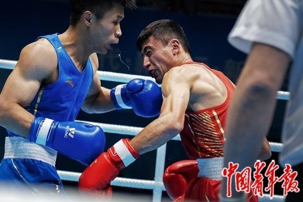 11月14日,广东深圳,十五运会拳击男子63.5公斤级决赛,广东队选手朱健豪(左)与新疆队选手伊卜拉伊木·马木提在比赛中展开对攻。中青报·中青网记者 田嘉硕/摄