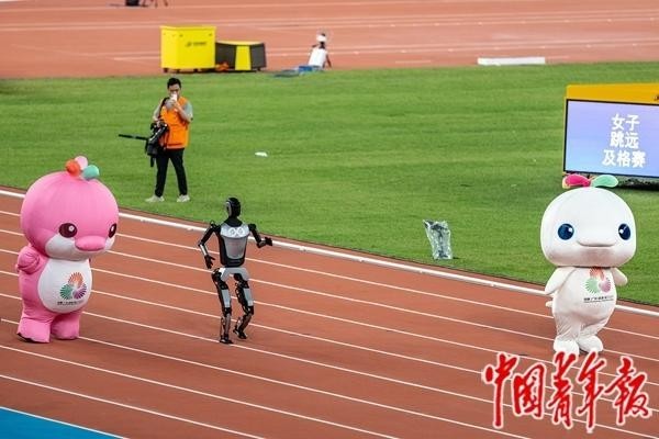 11月17日,广东广州,十五运会田径项目开始前,机器人和吉祥物喜洋洋、乐融融在赛跑。中青报·中青网记者 李隽辉/摄