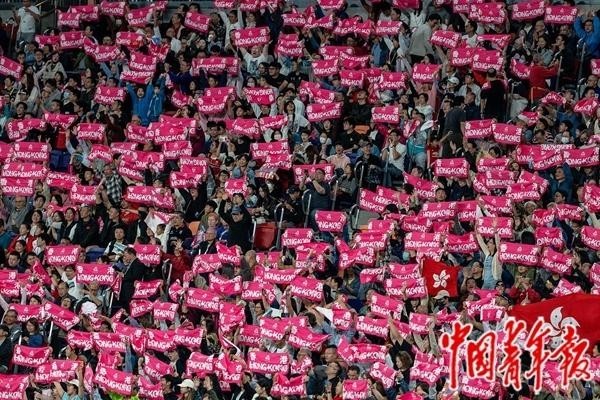 11月14日,香港,十五运会七人制橄榄球男子组决赛,现场观众为香港队加油。中青报·中青网记者 李隽辉/摄