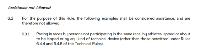 世界田联《田径技术准则》第6.3.1条明确规定不允许“已被套圈或即将被套圈的运动员进行领跑”。《田径技术准则》截图