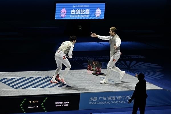 11月19日,十五运会男子花剑团体金牌赛在香港启德体育园启德体艺馆举行。由张家朗、蔡俊彦、梁千雨、吴诺弘组成的香港队,以45∶34击败福建队,夺得冠军。视觉中国供图