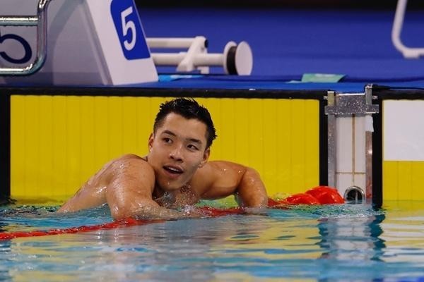 11月16日晚,在深圳大运中心游泳馆举行的十五运会男子50米自由泳决赛中,香港队何甄陶夺得冠军。图为何甄陶在比赛后。视觉中国供图