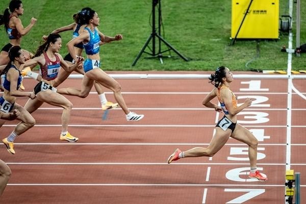 11月17日,广东广州,十五运会田径女子100米复赛,浙江选手陈妤颉在比赛中。最终她在决赛中以11秒10的成绩夺冠。视觉中国供图
