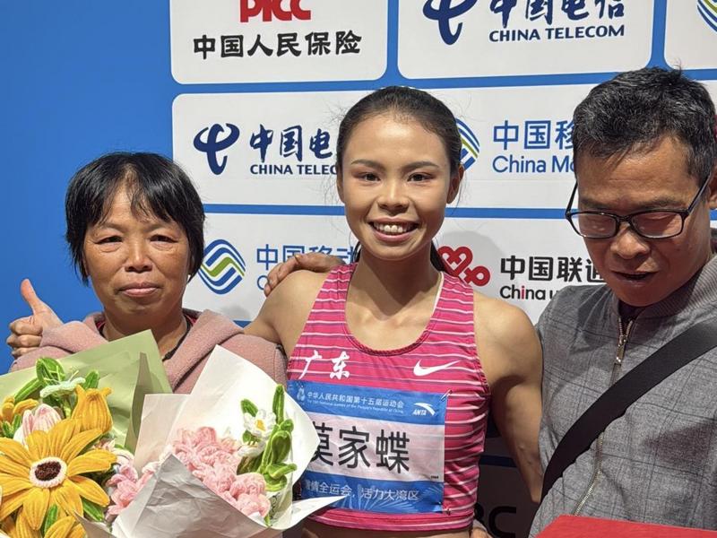 11月20日,十五运会女子4x400米决赛过后,莫家蝶与“惊喜现身”的父母合影。中青报·中青网记者 李梓昂/摄