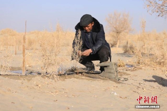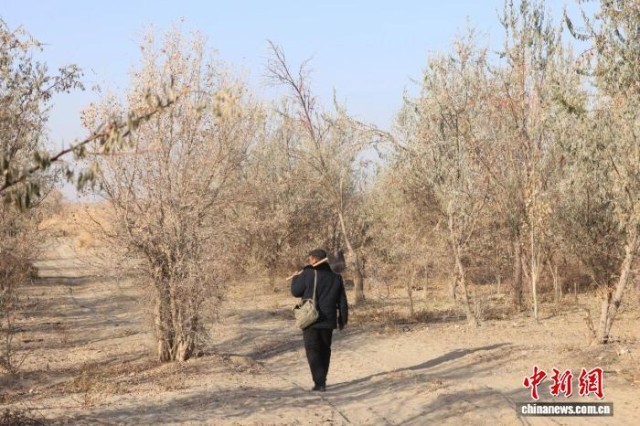 中新网新疆麦盖提11月27日电 (任鹏程 陈文军 艾斯凯尔·赛麦提)冬日的塔克拉玛干沙漠透着刺骨寒意。近日,在新疆麦盖提县沙海林场的林间小道上,护林员阿布都莫明·衣明一大早便开始了一天的巡护工作。