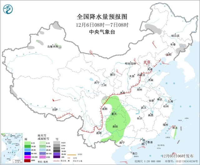 12月6日08时至7日08时,新疆北疆北部和伊犁河谷、内蒙古东北部、吉林东部、西藏西部等地部分地区有小到中雪或雨夹雪。四川东部、重庆、贵州、云南东南部、广西西部、湖南西部、台湾岛等地部分地区有小雨。内蒙古、辽宁中南部等地部分地区有4~6级风,西藏北部有7~8级风,巴士海峡、南海东北部海域将有5~7级风,阵风8级。