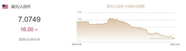 中新网12月5日电 据中国外汇交易中心网站消息,中国人民银行授权中国外汇交易中心公布,2025年12月5日银行间外汇市场人民币汇率中间价为:1美元对人民币7.0749元,下调16个基点。