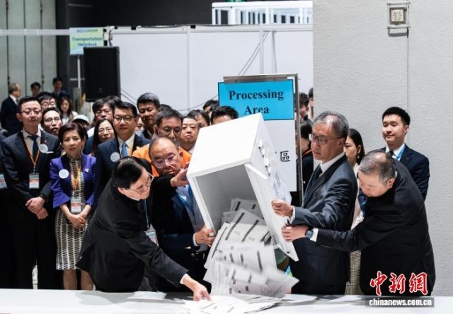 12月7日23时30分许,香港特区第八届立法会选举投票结束,随即开始点票工作。图为香港特区政府政制及内地事务局局长曾国卫(前排左二)、香港特区选举管理委员会主席陆启康(前排右二)等在位于香港会议展览中心的中央点票站倒出选举委员会界别投票箱中的选票。 中新网记者 侯宇 摄