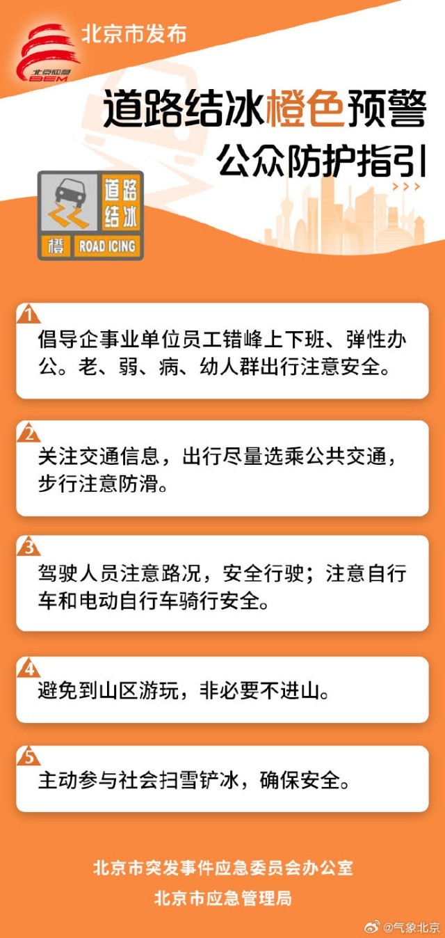 中新网12月11日电 据北京市气象局官方微博消息,北京市气象台2025年12月11日18时发布道路结冰橙色预警信号:预计,12日凌晨至夜间北京市将出现降雪天气,因地表温度低于0℃,12日中午至13日将出现对交通有较大影响的道路结冰,请注意防范。
