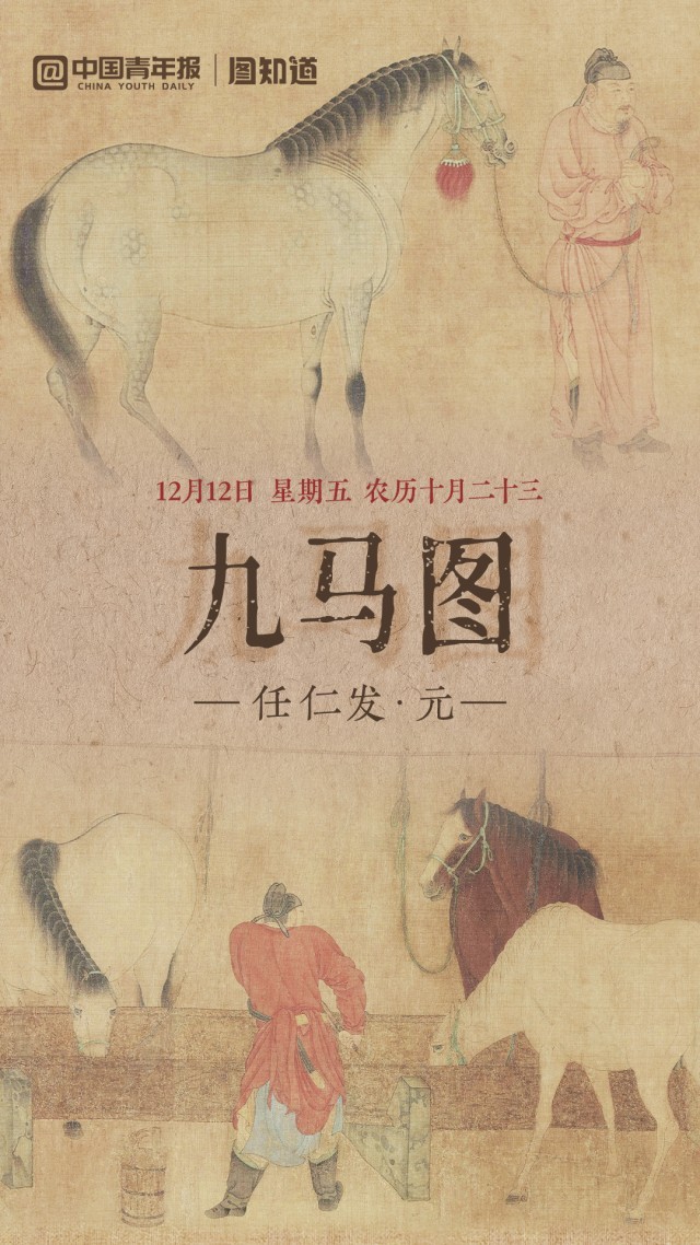 今天是12月12日,星期五,农历十月二十三。七倌九马,或牵马而行,或饲马喂马。九马雄壮矫健,皮鬃致密纤细,刻画生动。早安,朋友!(文案/朱梓轩 AI生成、剪辑/李晗)