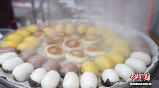 12月13日,沈阳小河沿早市,热气腾腾的各色粘豆包整齐摆放。李雪飞 摄
