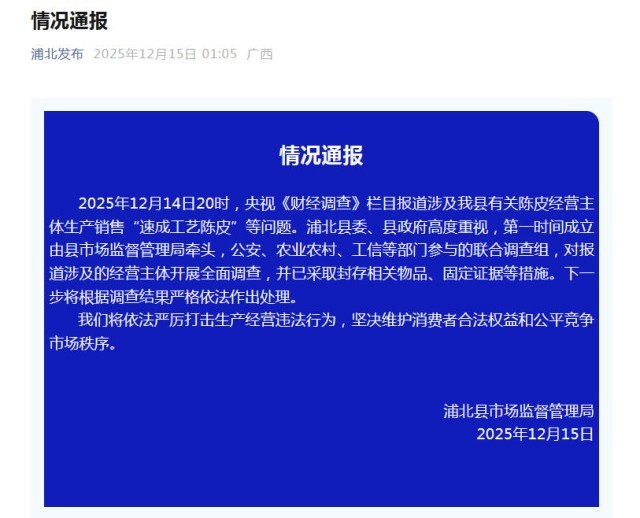 中新网12月15日电 据“浦北发布”微信公众号消息,2025年12月14日20时,央视《财经调查》栏目报道涉及广西钦州市浦北县有关陈皮经营主体生产销售“速成工艺陈皮”等问题。浦北县委、县政府高度重视,第一时间成立由县市场监督管理局牵头,公安、农业农村、工信等部门参与的联合调查组,对报道涉及的经营主体开展全面调查,并已采取封存相关物品、固定证据等措施。下一步将根据调查结果严格依法作出处理。