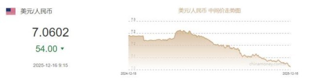 中新网12月16日电 据中国外汇交易中心网站消息,中国人民银行授权中国外汇交易中心公布,2025年12月16日银行间外汇市场人民币汇率中间价为:1美元对人民币7.0602元,上调54个基点。