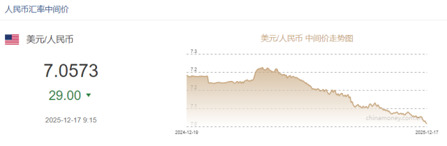 12月17日人民币对美元中间价报7.0573元 上调29个基点