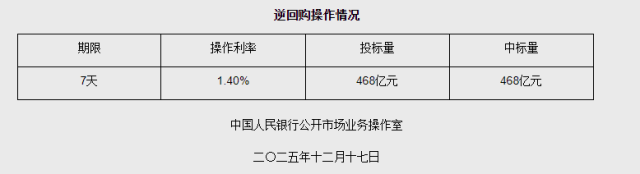 中新网12月17日电 据央行网站消息,2025年12月17日中国人民银行以固定利率、数量招标方式开展了468亿元7天期逆回购操作。具体情况如下: