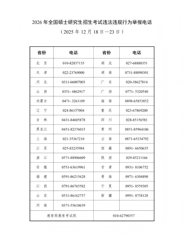 现向社会公布2026年全国硕士研究生招生考试违法违规行为举报电话,欢迎广大考生和公众参与监督。
