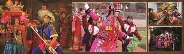 空中飘舞着莹莹白雪,灯歌队的队员们身着彩色特色服饰,在铿锵的锣鼓声中现身街头。他们时而围成圆圈,模仿划桨竞渡的动作,时而排成队列,展现田间耕作的场景,围观的群众也跟着熟悉的旋律应和。