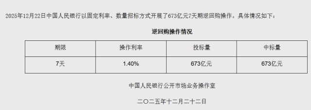 中新网12月22日电 据央行网站消息,2025年12月22日中国人民银行以固定利率、数量招标方式开展了673亿元7天期逆回购操作。具体情况如下: