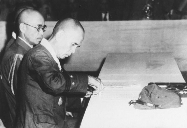 1945年9月9日,南京举行中国战区日军投降仪式,侵华日军总司令冈村宁次代表日军签署投降书。